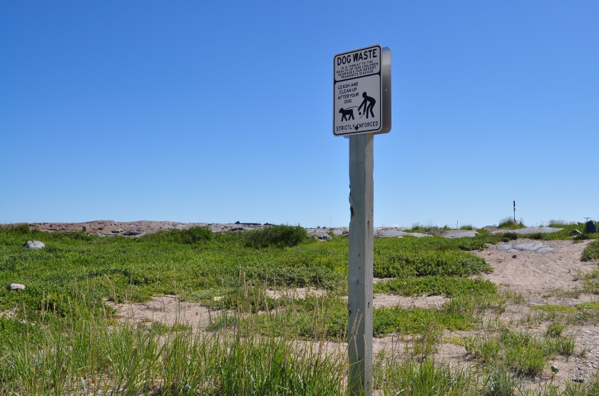 Peng, das hat gesessen. Ich gelobe mir selbst im Falle eines Falles sehr vernünftig zu sein. Denn das nördliche Manitoba an der Hudson Bay ist Eisbärenland. Gerade jetzt im Sommer kann überall zwischen den Felsen einer von ihnen herumstreunen. Die entsprechenden Warnschilder hatte ich ja schon unten an der Küste gesehen.