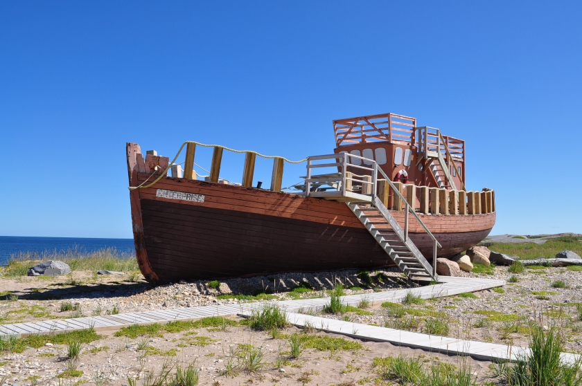 Vorbei am Hafen geht es zurück ins Städtchen, das wie immer ziemlich verschlafen da liegt. Wo sind die bloß alle? Jedenfalls auch nicht unten am Meer. Uns empfängt nur ein riesiges Steingebilde. Es ist ein Inukshuk, was übersetzt ungefähr bedeutet: Sieht aus wie ein Mensch. Inuksuit (das ist der Plural von Inukshuk) dienten den Eskimos als Wegweiser, Landmarken, Warnhinweise.