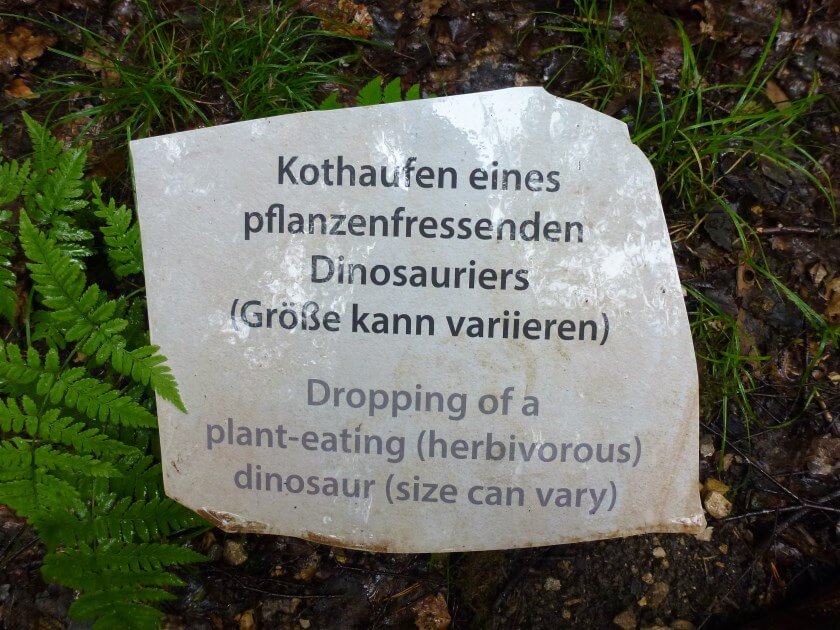 Aber naja, der dichte Wald, der platternde Regen, die Dinos überall – ich fühle mich schon ein bisschen an die eine oder andere Szene erinnert. Eben stand ich noch unter dem Bauch eines gigantischen Langhalssauriers, dann schwebt ein Flugsaurier durch die Lüfte und um die nächste Kurve stehen sich zwei Dinos angriffslustig gegenüber. Der Europasaurus holgeri lugt ganz freundlich zwischen den Bäumen hervor. Er oder Sie lebte vor rund 155 Millionen Jahren auf einer Insel im heutigen Niedersachsen. Wir sind also sozusagen Landesgenossen.