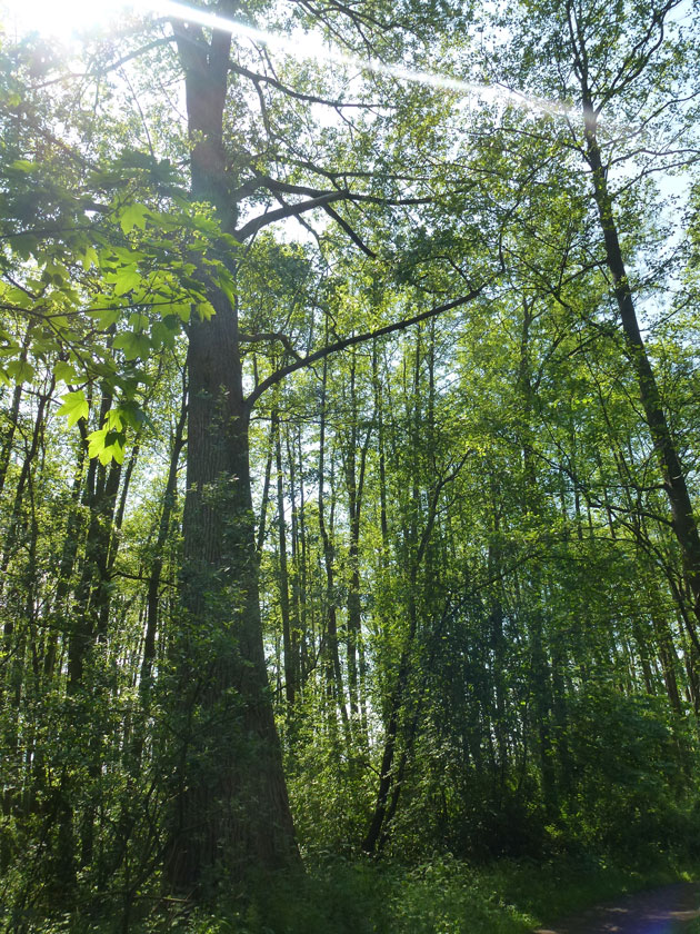 Dann jedoch führt der Weg in einen Wald. Fichten, Kiefern, Laubbäume, sieht eigentlich alles ganz normal aus. Ich habe Durst und bleibe stehen. Sofort stürzt sich eine Mückenarmada auf mich. Der norddeutsche Amazonas lässt grüßen. Natürlich habe ich KEIN Mückenspray dabei. Es hilft also nur eines: Tempo machen, nicht stehenbleiben. Und tatsächlich – die Mücken lassen sich abhängen.