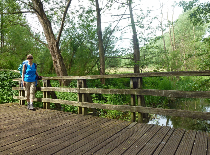 Der zweite Tag, ich bin neugierig auf den Amazonas des Nordens. Die Ufer der Wakenitz sind geschütztes Gebiet, mit einer reichen Tierwelt (Wasservögel, Biber, Otter und Co.), die nicht gestört werden soll. Auch deshalb führt der Weg nur selten direkt am Fluss entlang, sondern mäandert durch die Landschaft. Mal durch einen Erlenbruchwald – Kranichland, ich habe natürlich keine gesehen, aber gehört! – dann durch eine sanfte Kulturlandschaft, die von Biohöfen bewirtschaftet wird.