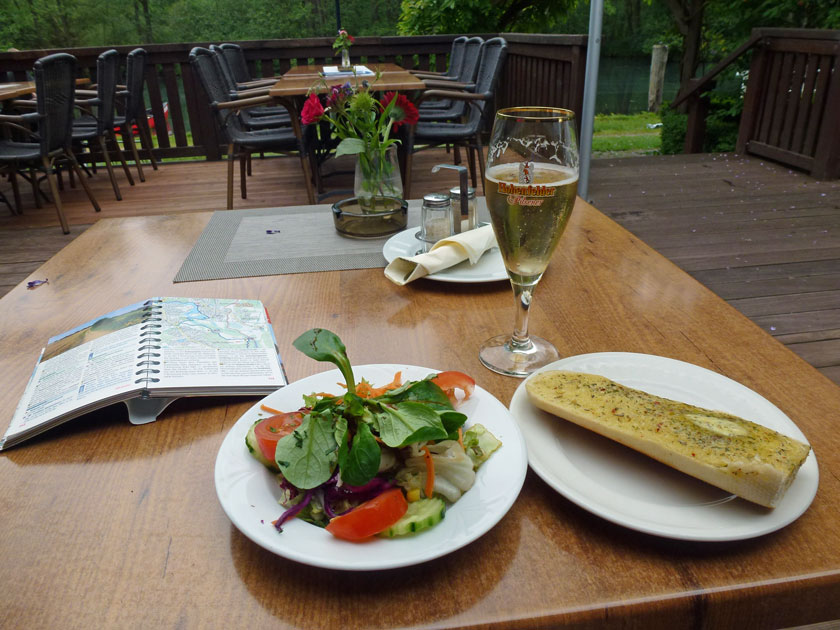 Am Tisch neben mir nimmt eine Gruppe „Silver Ager“ Platz. Netter Gruß, neugierige Blicke. Irgendwann halten sie es nicht mehr aus: „Sind Sie zu Fuß unterwegs?“ Ja, sage ich und erkläre kurz meine Tour. Ehrfürchtiges Schweigen. Dann: „Ganz alleine?“ Äh, ja… Respektvolles, aber auch besorgtes Nicken. Eine Frau alleine unterwegs… Wir sind mitten in Deutschland, wohlgemerkt. Wäre ich ein Mann, wären die Reaktionen sicher anders. Ist es wirklich die Normalität, dass Leute gleich an „riskant“ denken, wenn Frauen alleine unterwegs sind? Was sagt uns das?